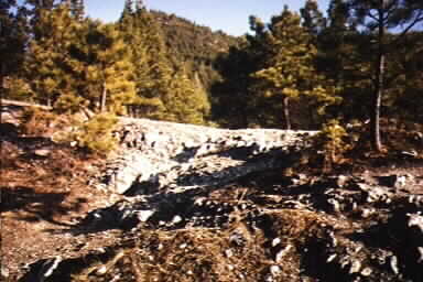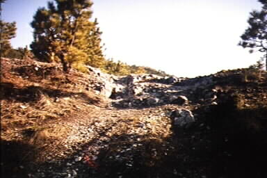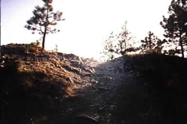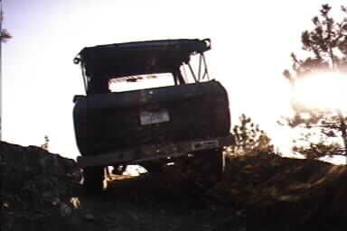I then drove around on the network of trails, and started climbing up a narrow trail that only a Scout (or a flatfender) could squeeze between the trees.. I made it up one very steep trail only to find it dead-ended.. then I had to back down the trail, wi th the close trees scratching at my soft top in both directions.