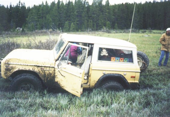 Naturally, Mike was the first to test the marshy section of the trail.. and promptly had the Bronco buried to the top of the tires again. Eric yanked him out, and then Mike took another run at it, on a different approach, and made his way through.