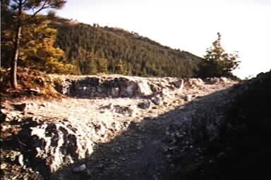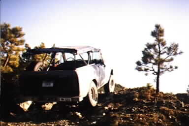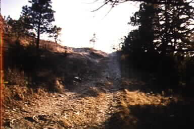 I then drove around on the network of trails, and started climbing up a narrow trail that only a Scout (or a flatfender) could squeeze between the trees.. I made it up one very steep trail only to find it dead-ended.. then I had to back down the trail, wi th the close trees scratching at my soft top in both directions.