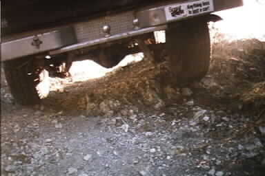 For the climb back down the rocks (The "Guardian" of these trails! *grin*) I chose the other side.. the many stair step rocks. This looked much easier going down that it did coming up, so I gently eased my front tires down a few steps, and periodically g ot out to check clearances and such, getting a much better feel for what my Scout can now do. I bounced a few times, and made my way to the bottom. Oh.. I should not that while climbing up and down this rock "cliff", I was truly impressed with how much my 31x10.5s will flex when aired to just 26psi.. they really flexed as the truck would rock back and forth.. but not enough to cause any damage.