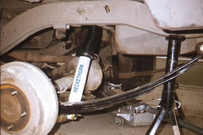 A close up shot of just one side done.. you can see the 20 yr old shock on the passenger side still, and maybe notice how much lower the driver's side of the axle is (since it has the "lift" springs installed)
